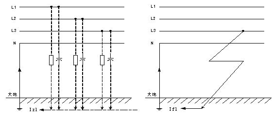 圖1 線路正常時絕緣電阻及分布電容對地漏電示意 圖2 線路非正常對地漏電示意